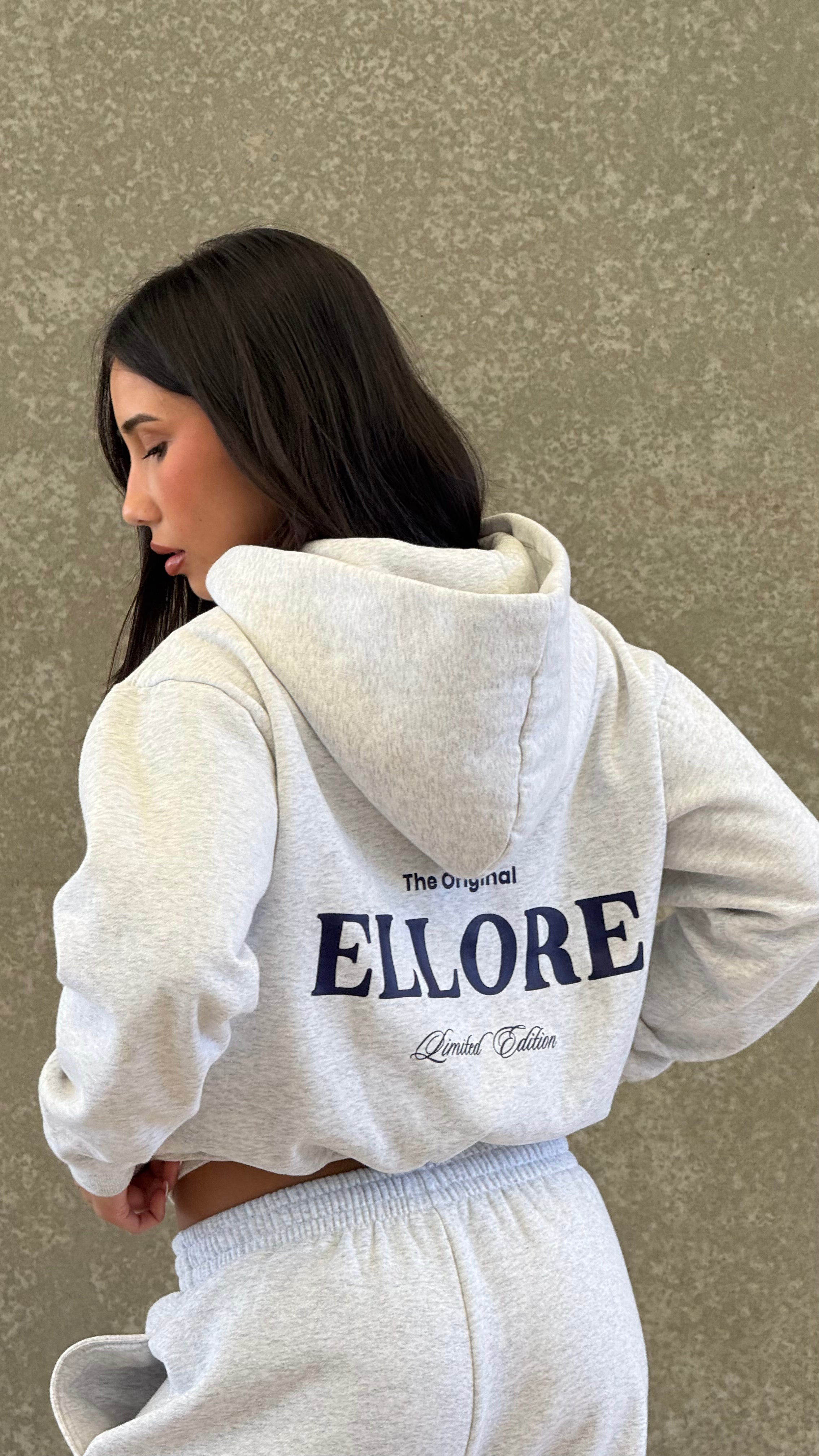 The kangaroo pouch pocket makes it functional on the go, and the Limited Edition ‘ELLORE’ logo detail on the back adds an elevated touch. Designed with a cropped length and boxy fit, it pairs seamlessly with the rest of the Jet Set Marle in Midnight pieces or stands perfectly on its own.